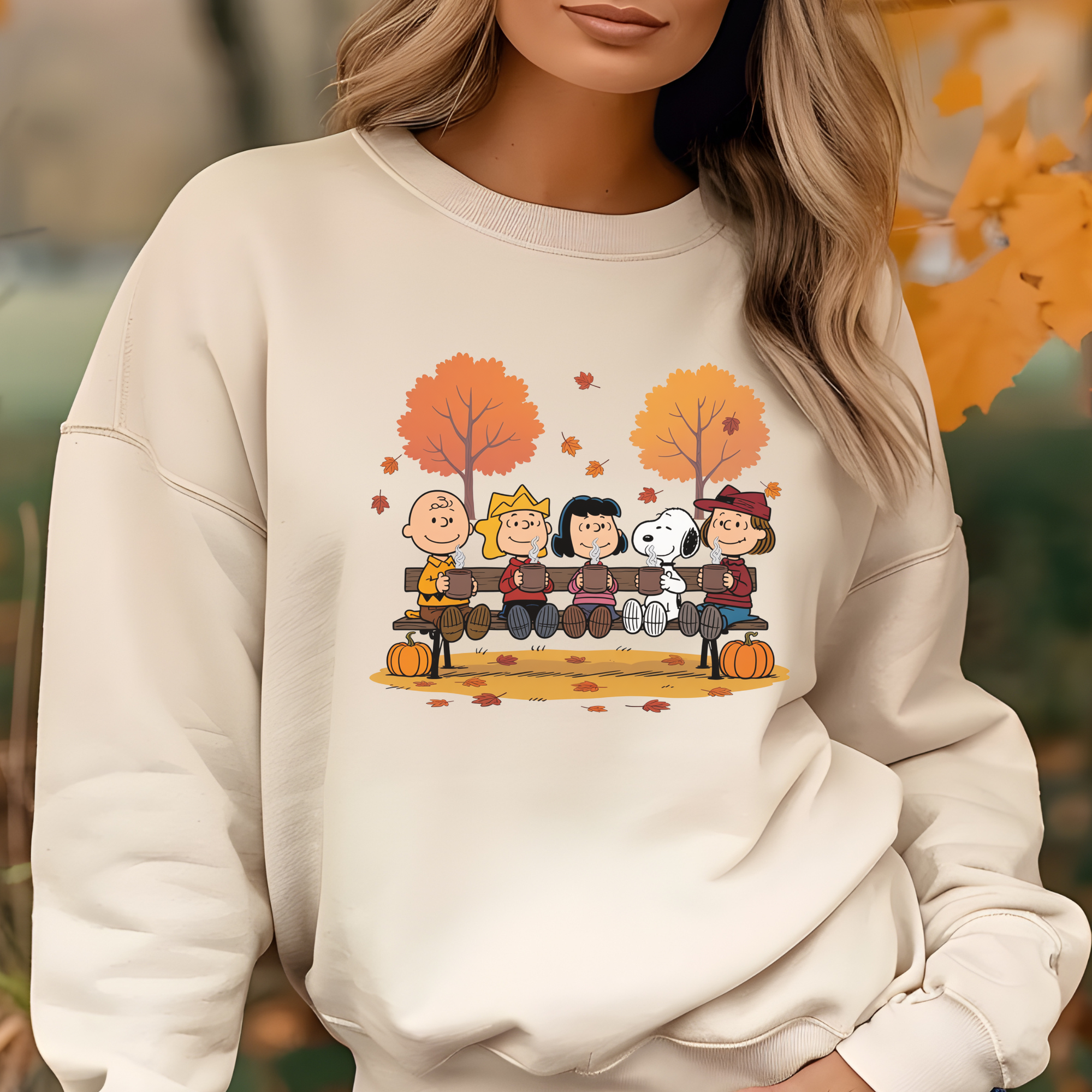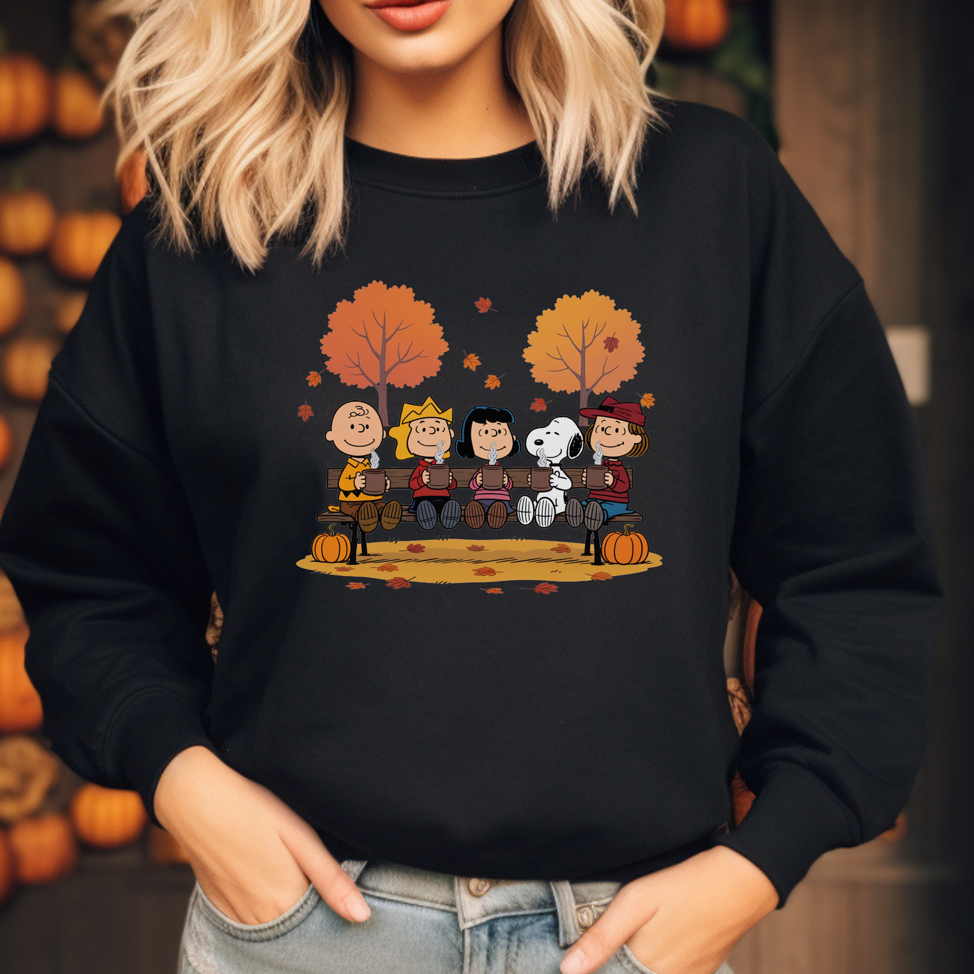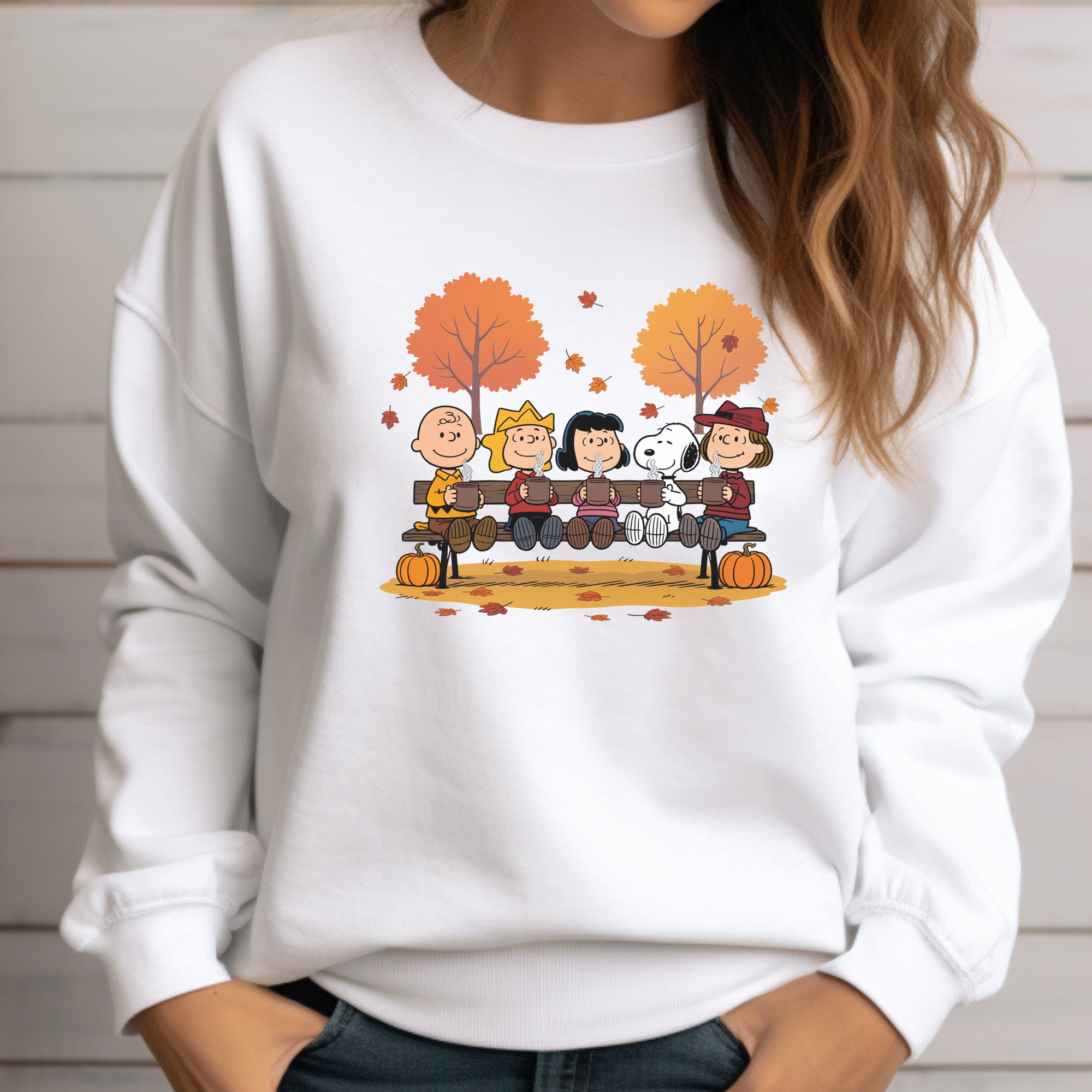 Kick back with the gang and sip on some pumpkin spice in this adorable Peanuts-inspired fall sweatshirt! 🍁