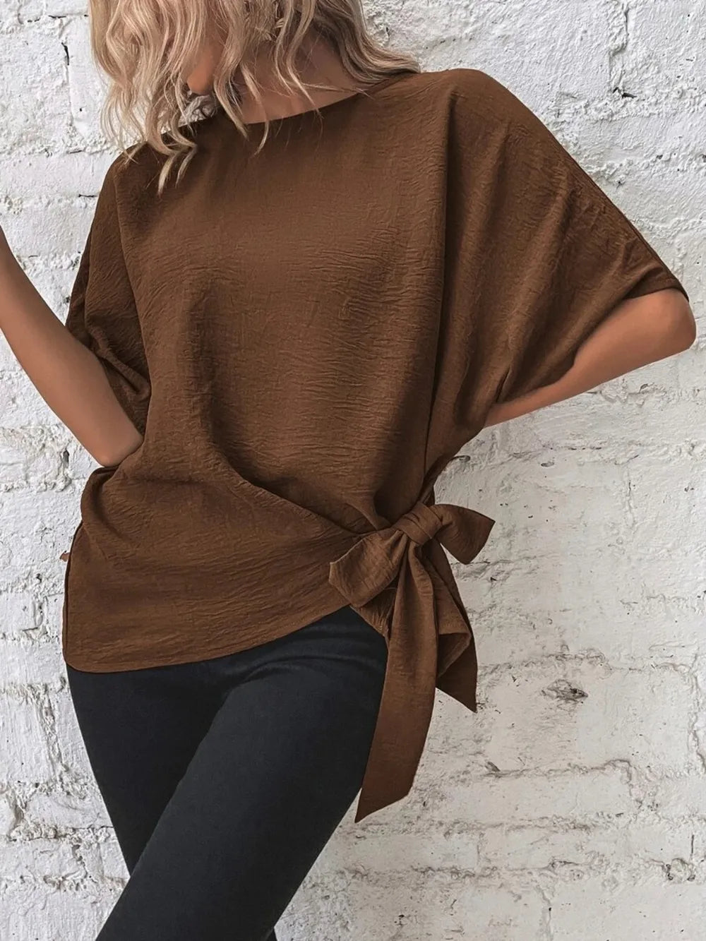 Introducing the Julia Blouse, the perfect blend of style and comfort. Featuring a knotted round neck and half sleeves, this blouse is a must-have for any fashion-forward wardrobe. Stay effortlessly chic and comfortable all day long.
