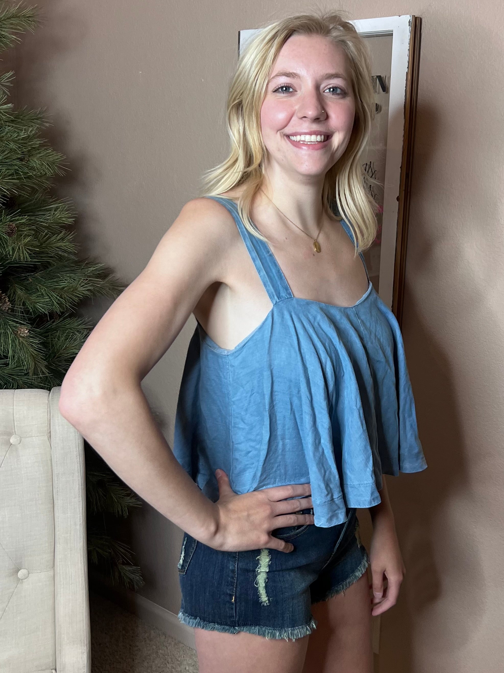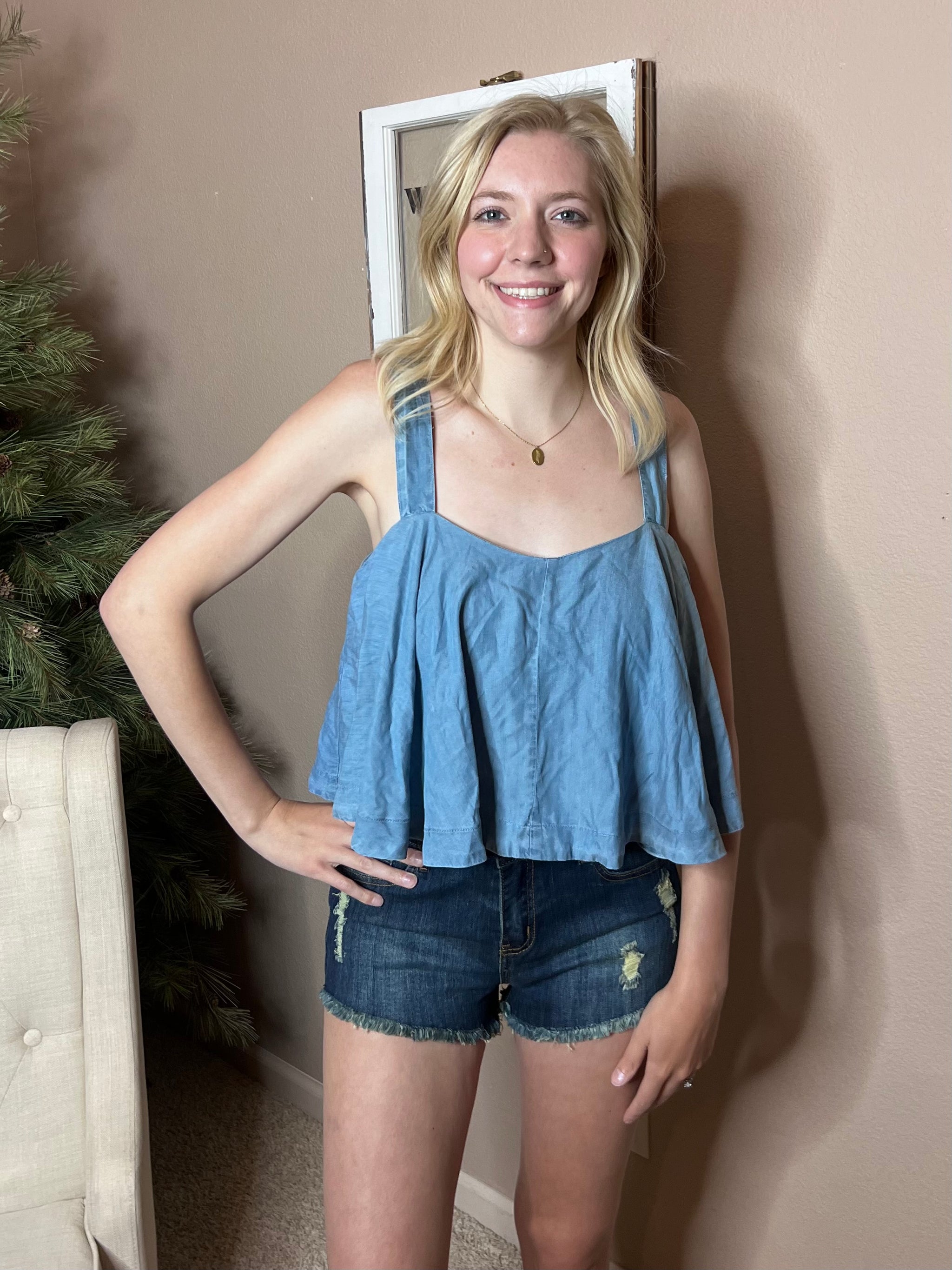 Mi & Lu Tiffany Denim Colored Crop Ruffle Top